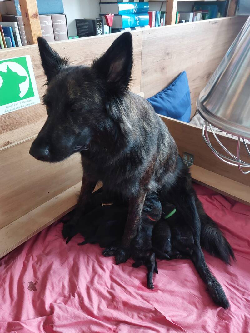 Het ging allemaal heel snel, 's nachts was Eefke onrustig geweest en 's morgens ook. Wilde eigenlijk niet van huis, was maar aan t nestelen op de bank en in de werpkist. Weeën kwamen tegen einde van de ochtend en begin van de middag zag ik de eerste perswee. En toen ... 5 minuten later was ineens het eerste pupje geboren. Magisch en Eefke deed het geweldig. Uiteindelijk is het laatste pupje geboren rond 19:15. In nog geen 5 uur kwamen alle 6 pups ter wereld, 5 teefjes en een reutje. Eefke deed het voortreffelijk en alle pups zijn gezond en hebben een mooi geboorte gewicht.